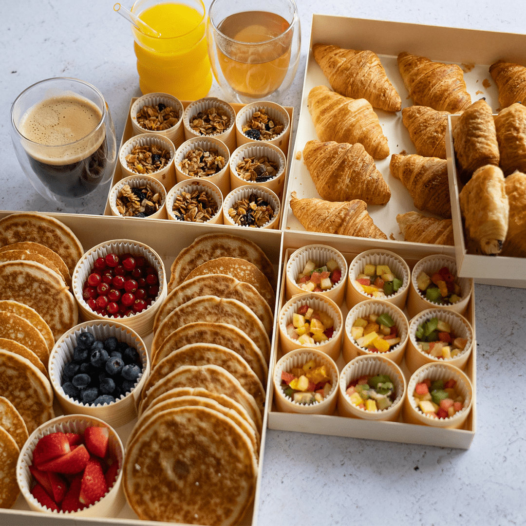 La formule prestige, un petit-déjeuner complet et raffiné : deux pancakes maison, une part de brioche tranchée, une verrine de salade de fruits frais et une verrine de fromage blanc au granola, accompagnés d’un assortiment de trois boissons (café, thé et jus d’orange).