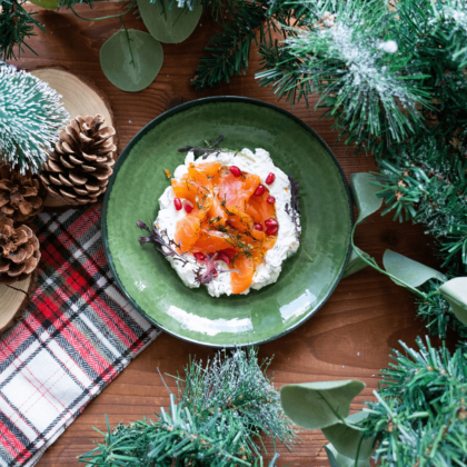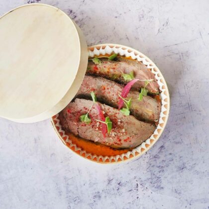 Saumon mariné aux saveurs d’agrumes et d’épices douces, relevé par la pointe piquante d’un labné au raifort : une entrée élégante et pleine de finesse.