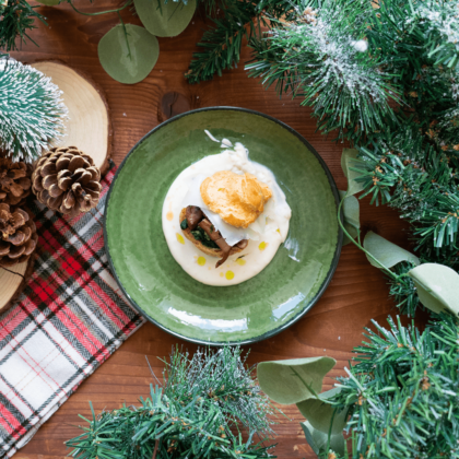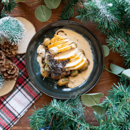 Suprême de volaille tendre accompagné de pommes de terre fondantes et de pleurottes, le tout nappé d’une sauce aux morilles onctueuse et parfumée.
