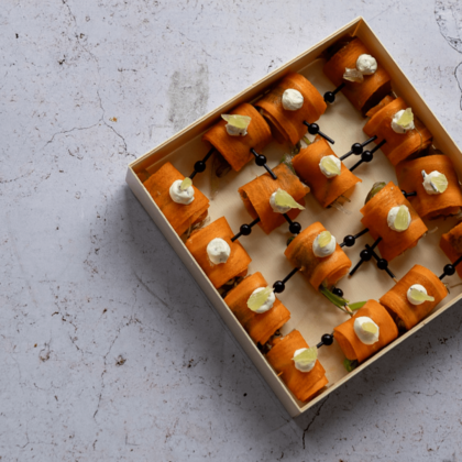 Alliance colorée et savoureuse entre poivron, houmous crémeux et carotte croquante, pour une pièce traiteur originale et raffinée.