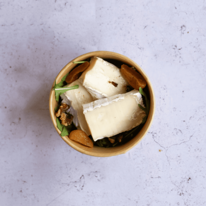 Brie à pâte molle et croûte fleurie, à la texture crémeuse et aux notes délicatement lactées, servi avec roquette et noix.