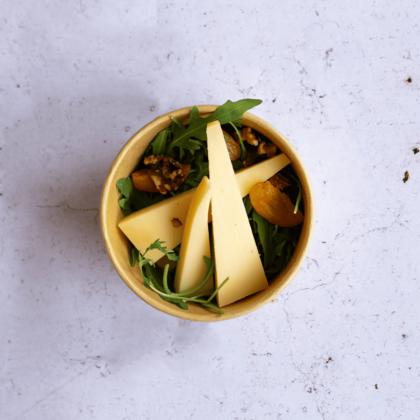 Comté AOP à pâte pressée cuite, au goût fruité et légèrement torréfié, servi avec roquette et noix.