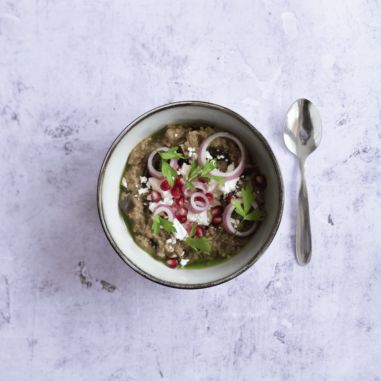 Ingrédients : Parmesan, Feta, Aubergine, Ail, Grenade, Coriandre, Pate de sésame, Huile d'olive