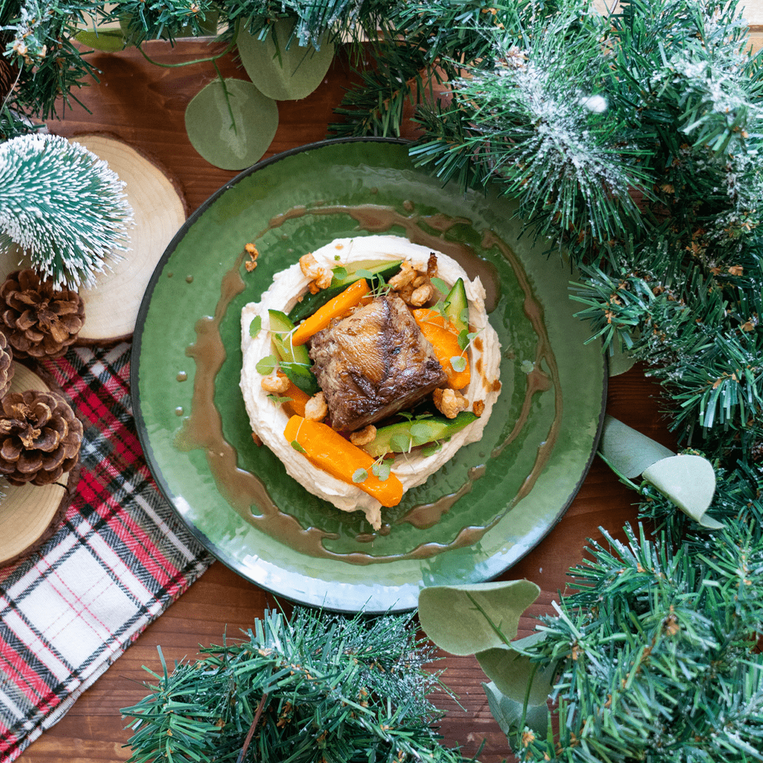 La douceur de l’agneau confit s’allie aux notes sucrées et délicates du blé aux fruits secs, pour un plat riche en saveurs.