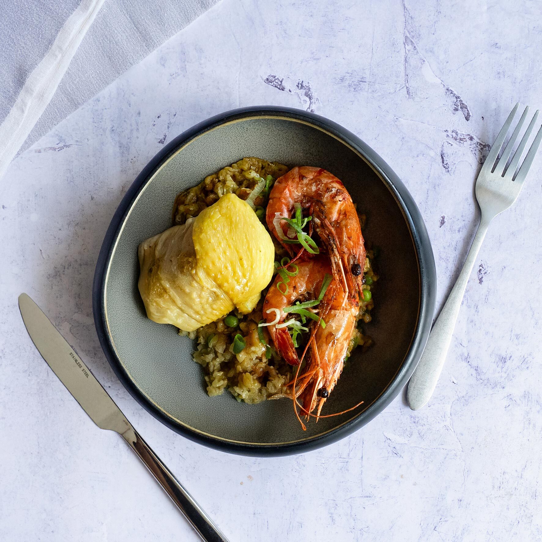 Un plateau repas qui fait voyager : découvrez notre paella crevette, le mariage parfait entre gourmandise et raffinement.