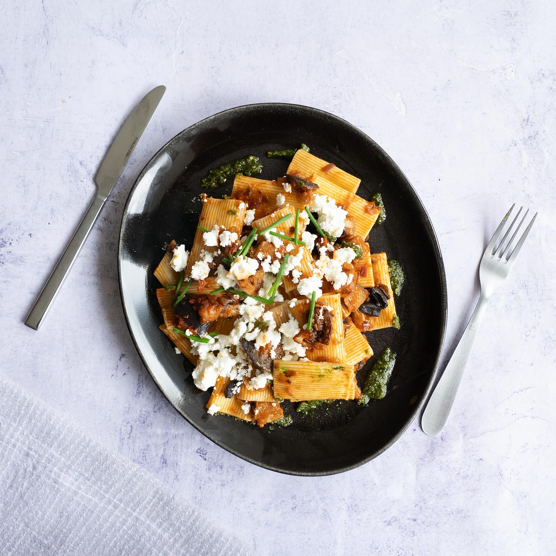 Ingrédients : Ricotta, Feta, Aubergine, Ail, Olive noir kalamata, Tomate, Rigatoni, Huile d'olive