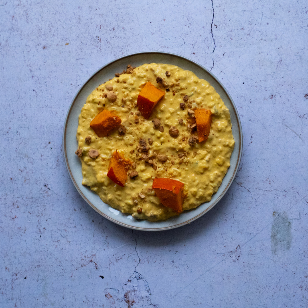 Ingrédients : Gorgonzola, Mascarpone, Parmesan, Crème, Oignon, Potimarron, Noisette, Riz