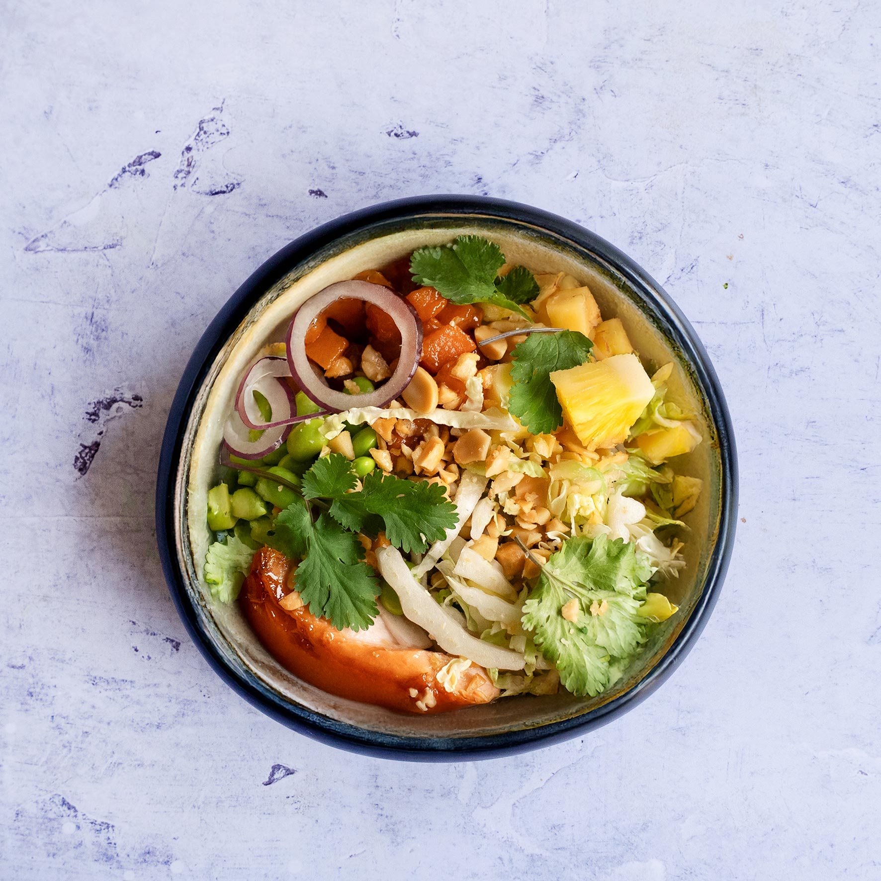Ingrédients : Saumon, Coriandre, Grenade, Chou chinois, Carotte, Citron vert, Ananas, Patate douce, Oignon rouge, Edamame, Huile de sésame, Sésame, Quinoa, Sauce soja, Nuoc mam, Cacahuètes