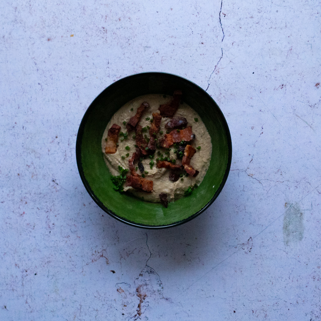 Un velouté de lentilles onctueux agrémenté de lardons savoureux, pour une entrée chaleureuse et réconfortante.