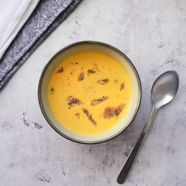 Le potimarron, avec sa chair douce et légèrement sucrée, forme la base de ce velouté. Il est soigneusement rôti pour intensifier ses saveurs naturelles et lui donner une profondeur exceptionnelle. Les châtaignes, avec leur goût subtil et leur texture crémeuse, sont ensuite ajoutées pour compléter et enrichir le potage.