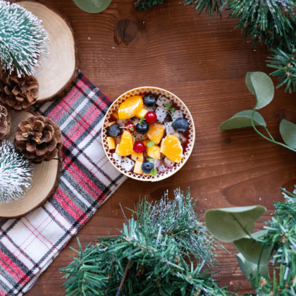 Une salade de fruits festive, composée de fruits frais et colorés, relevée d’une touche d’épices pour les saveurs de Noël.