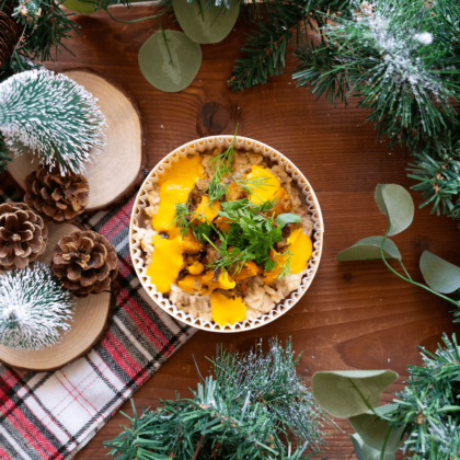 La douceur de l’agneau confit s’allie aux notes sucrées et délicates du blé aux fruits secs, pour un plat riche en saveurs.